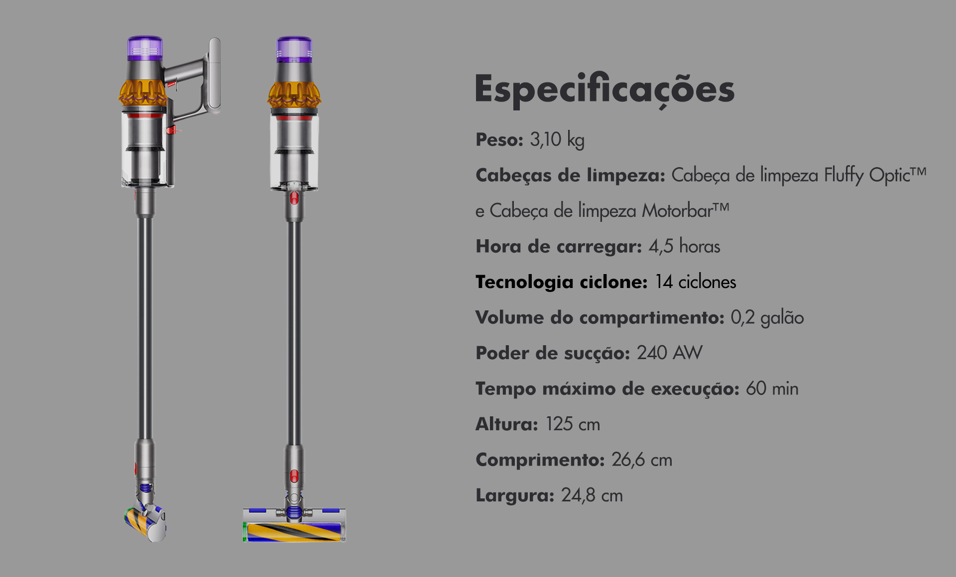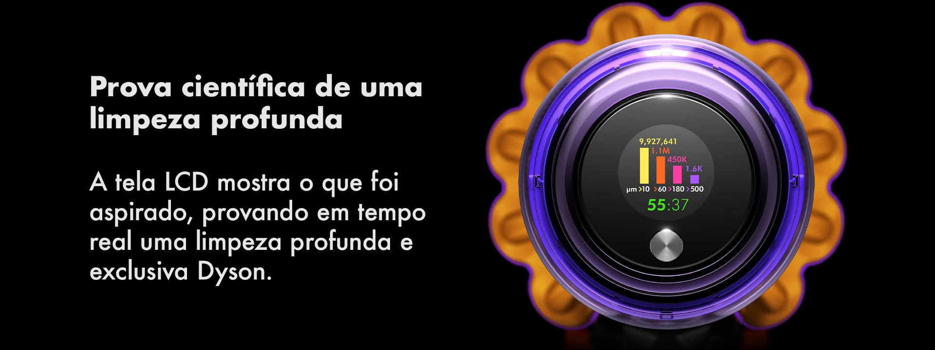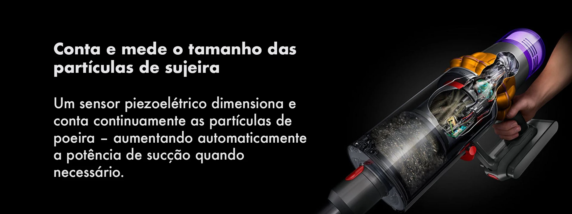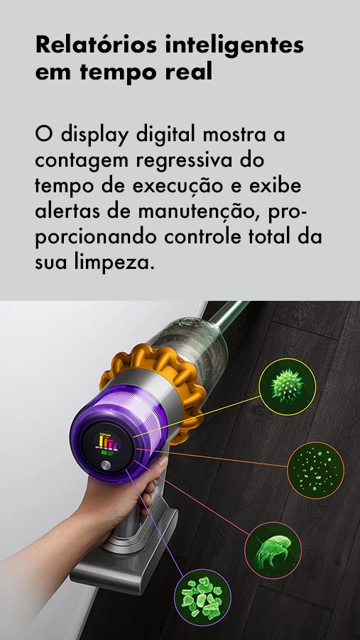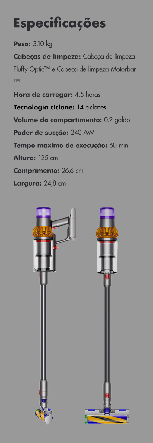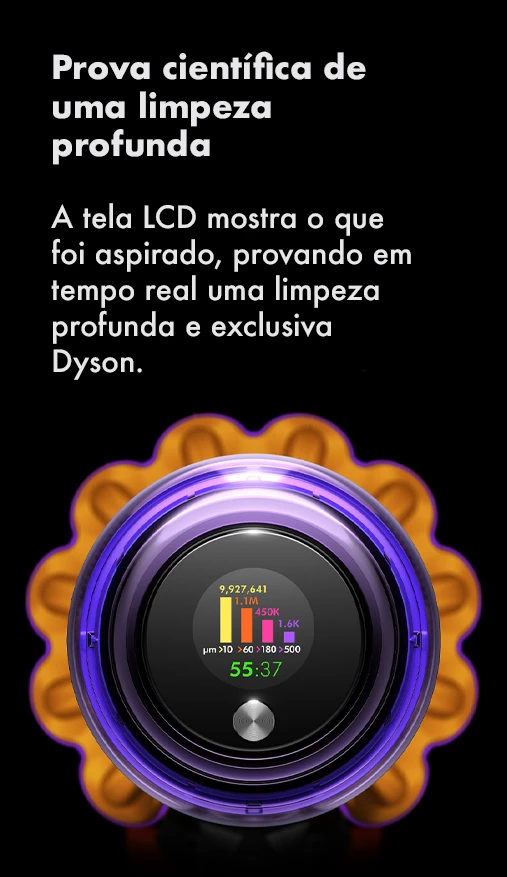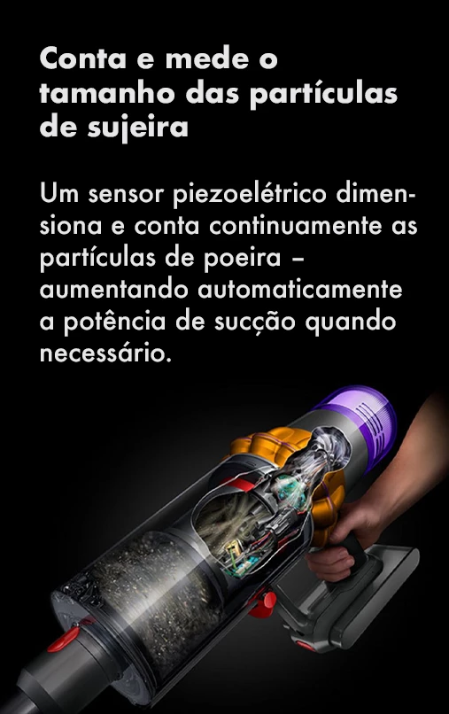 Os ciclones patenteados da Dyson geram uma força giratória de até 100.000g, retendo poeira fina e sujeira no recipiente, para que seu aspirador nunca perca a sucção.