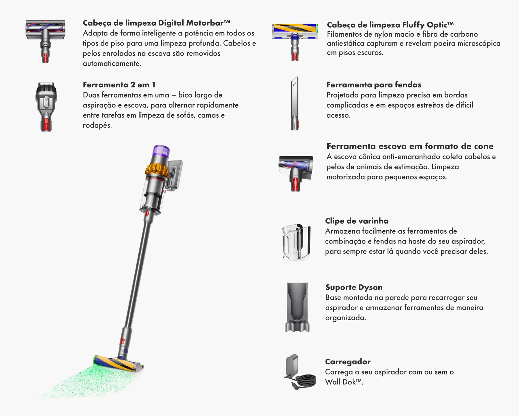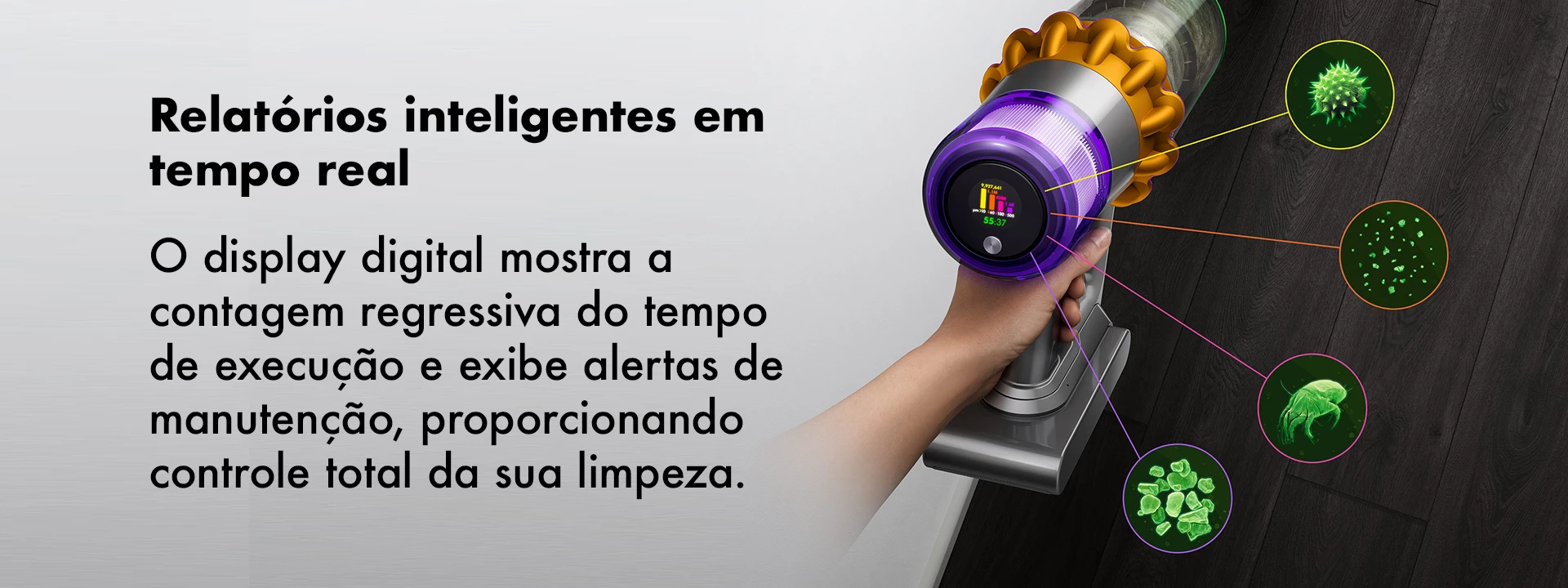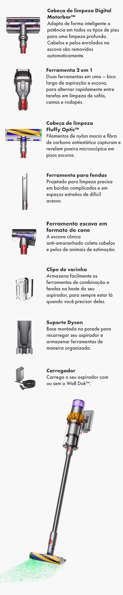 De-tangling Digital Motorbar ™ Aspira poderosamente poeira e cabelos de todos os pisos. Os pelos são removidos automaticamente da barra da escova.